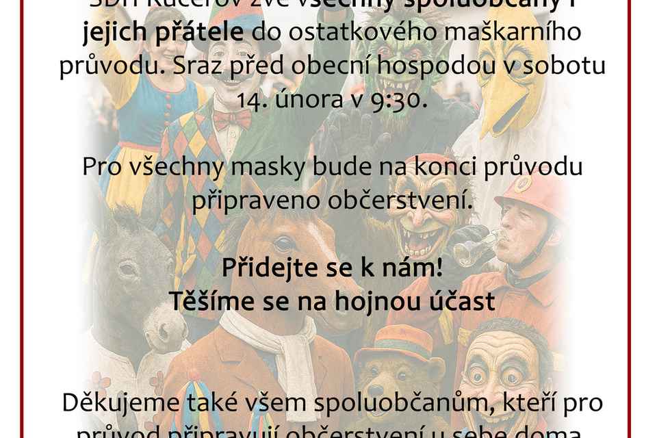 Tradiční maškarní průvod obcí se bude konat v sobotu 14. února. Zveme všechny spoluobčany a jejich přátele.